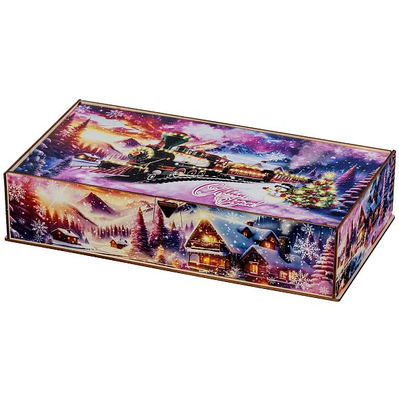 Секрет идеального новогоднего сладкого подарка прост: это яркая привлекательная упаковка и вкусные сладости внутри. “Снежный экспресс” - это подарочный набор, который как раз прекрасно подходит под эти характеристики. Это небольшая деревянная коробчка с очень необычным ярким оформлением. На ней изображен зимний вечер в небольшой деревне, рядом с которой по железной дороге весело мчится праздничный поезд. В этом поезде находятся счастливые люди, которые вот-вот смогут увидеться со своими родными и друзьями и отпраздновать с ними Новый год. В подарочный набор входит килограмм разнообразных сладостей, небольшой памятный сувенир и безграничная радость для всей семьи!