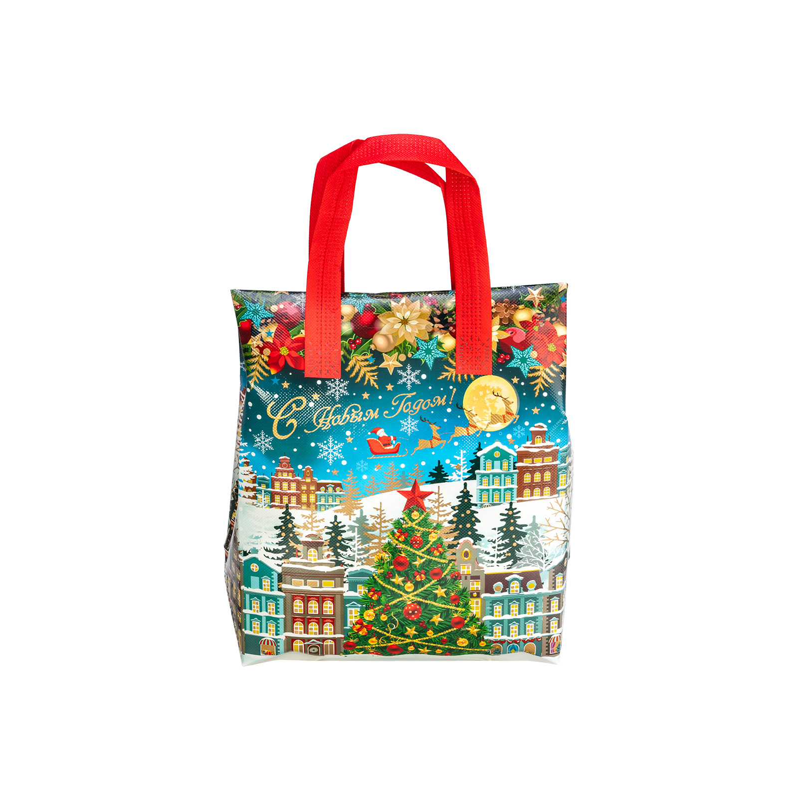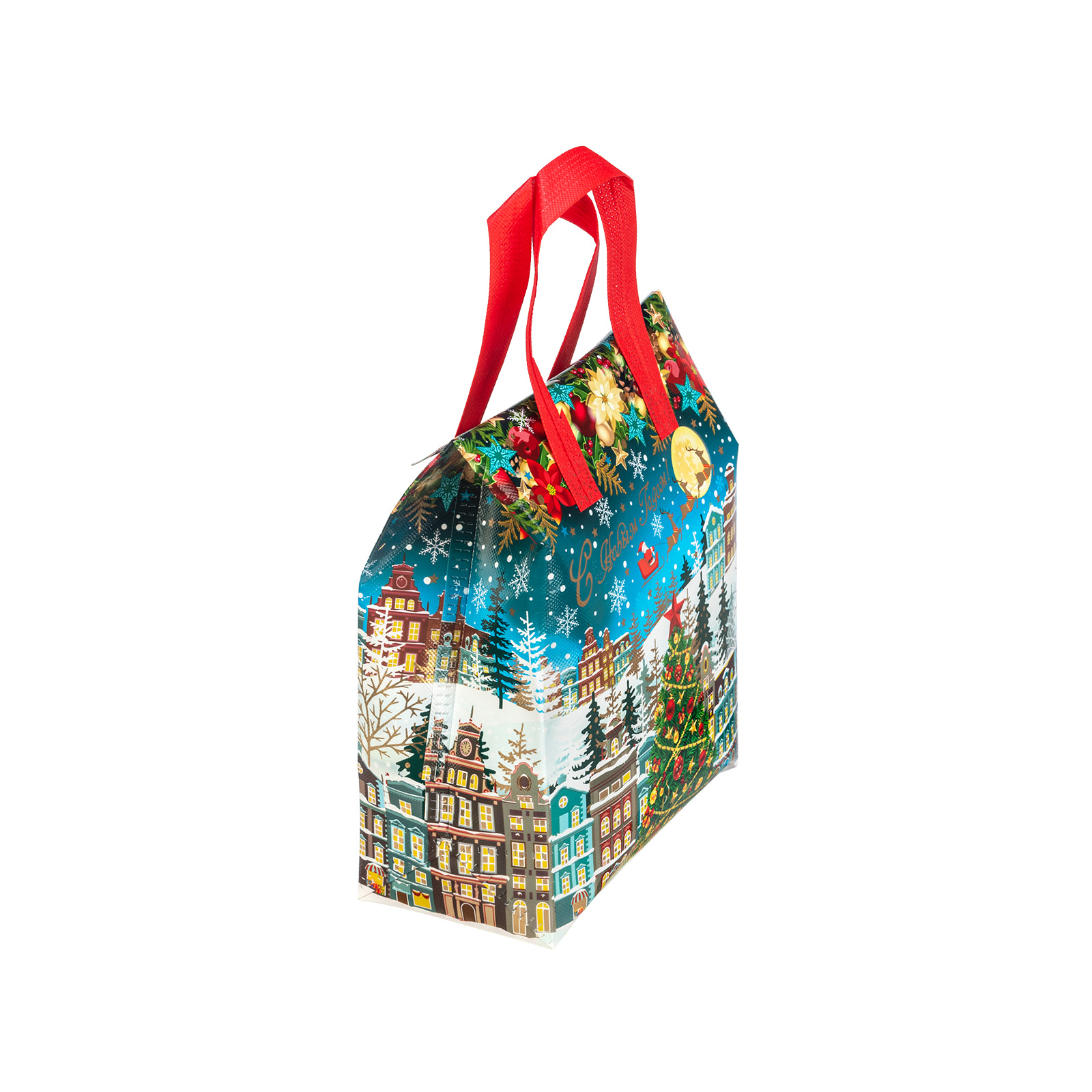 Интересный вариант новогоднего подарка – «Сумочка Чудо-городок». Отлично подойдет на подарок в 2026 году с символом Лошадь. Внутри такого презента находится кондитерский набор весом 1000 граммов.